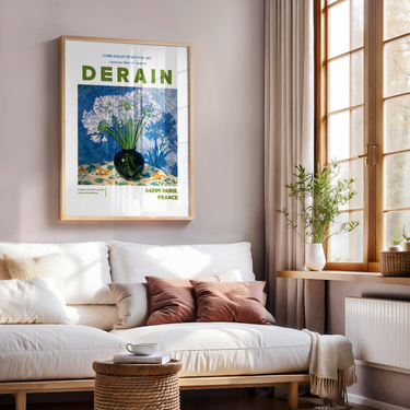 This André Derain–inspired poster radiates the harmony of Fauvism and classic elegance. The striking composition of delicate white blooms against bold blues and greens captures Derain’s signature balance between intensity and calm. Every brushstroke speaks to his mastery of light — translating stillness into vivid emotion.