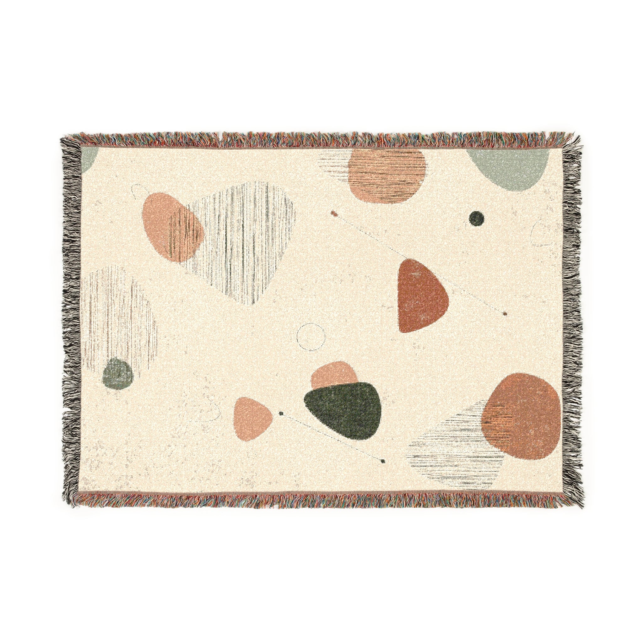 The Mid-Century Drift Woven Blanket brings the unmistakable rhythm of the 1950s straight to your sofa. With its floating geometric shapes, soft earth-tone palette, and playful atomic-era lines, it feels like a piece lifted from a designer’s mood board—back when modernism was new, cocktails were strong, and furniture had real swagger.