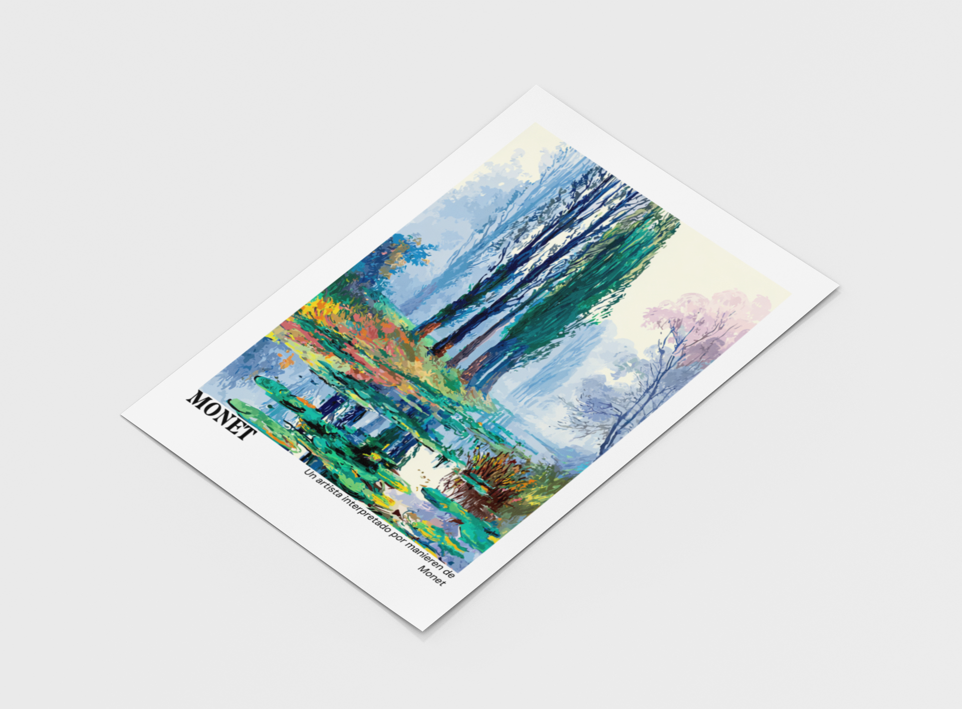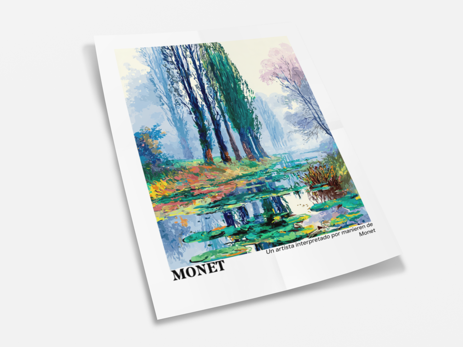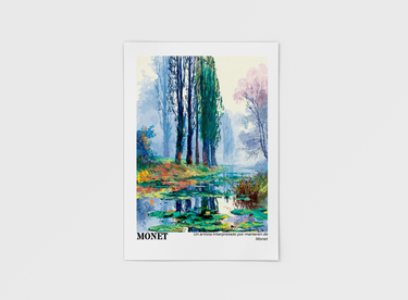 This Monet-inspired poster captures the quiet poetry of nature reflected in water. Tall poplars rise elegantly from the mist, their reflections merging with lily-covered waters in a dreamlike palette of greens, blues, and lilacs. The soft haze and fluid brushstrokes evoke the serenity and depth of Monet’s Giverny landscapes — where light dances and time seems to pause.