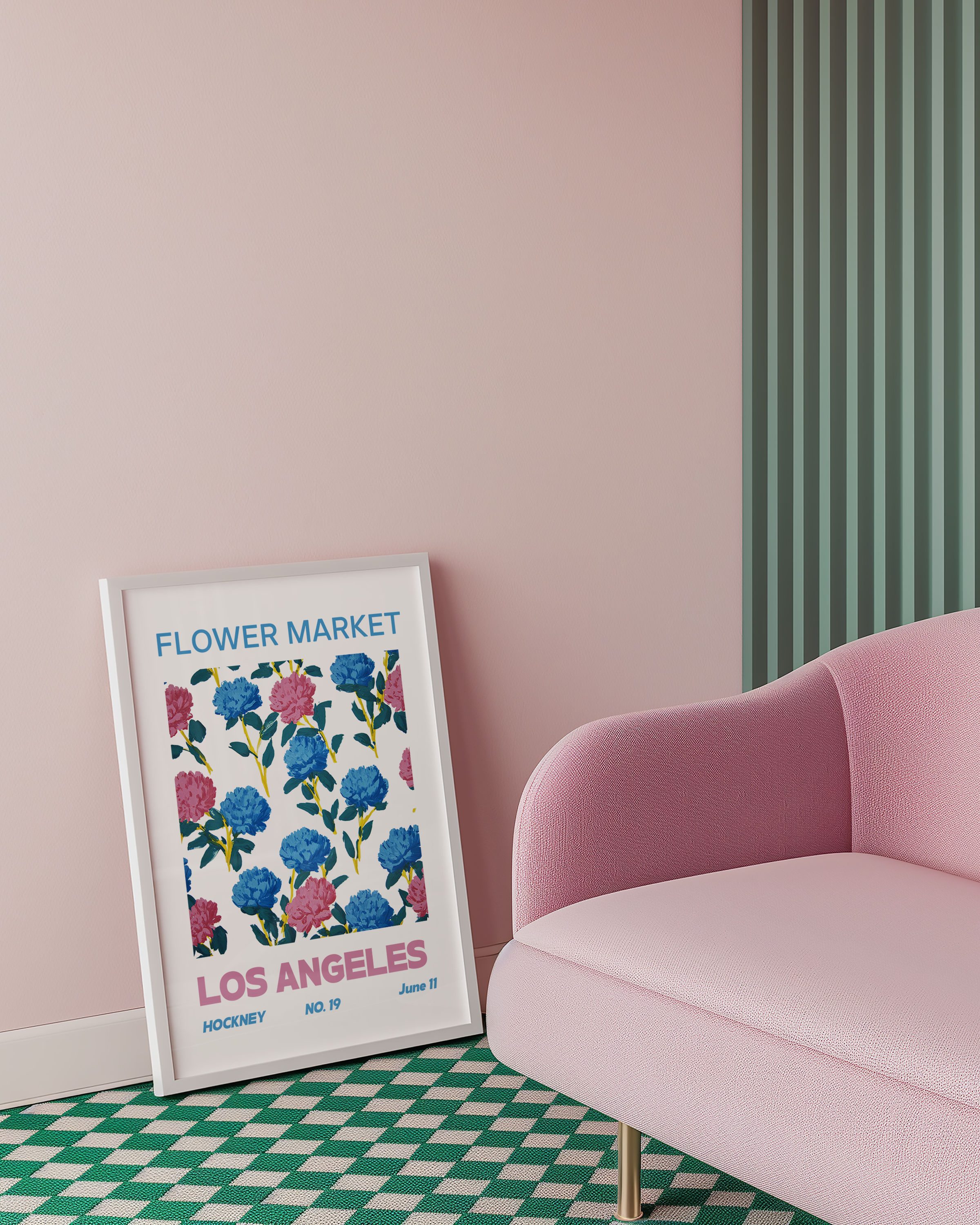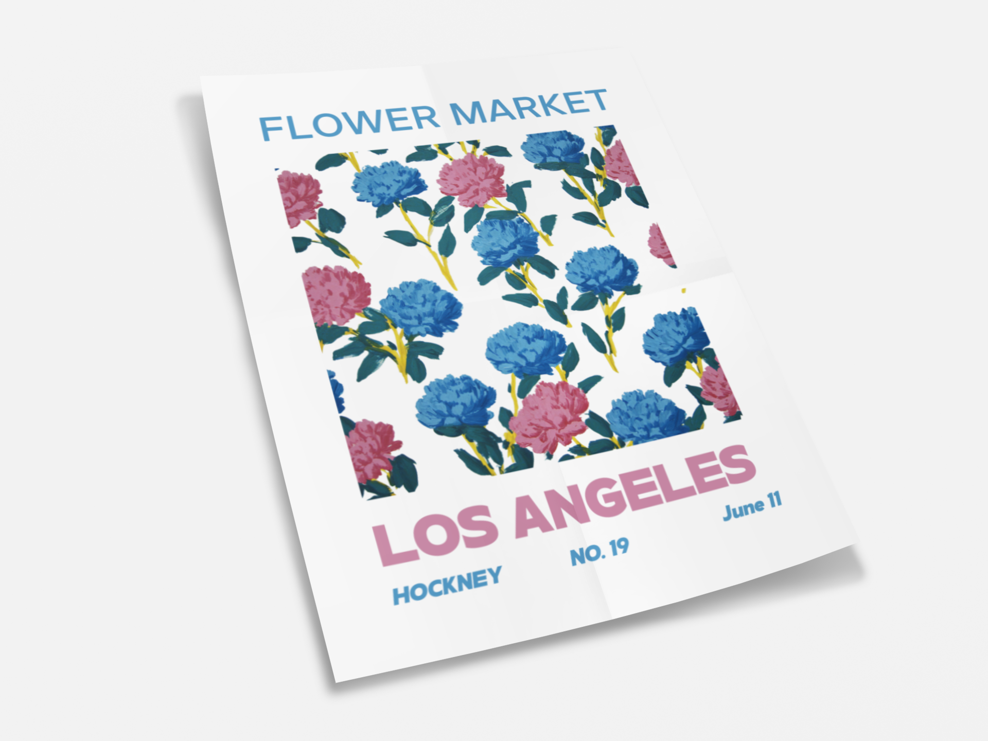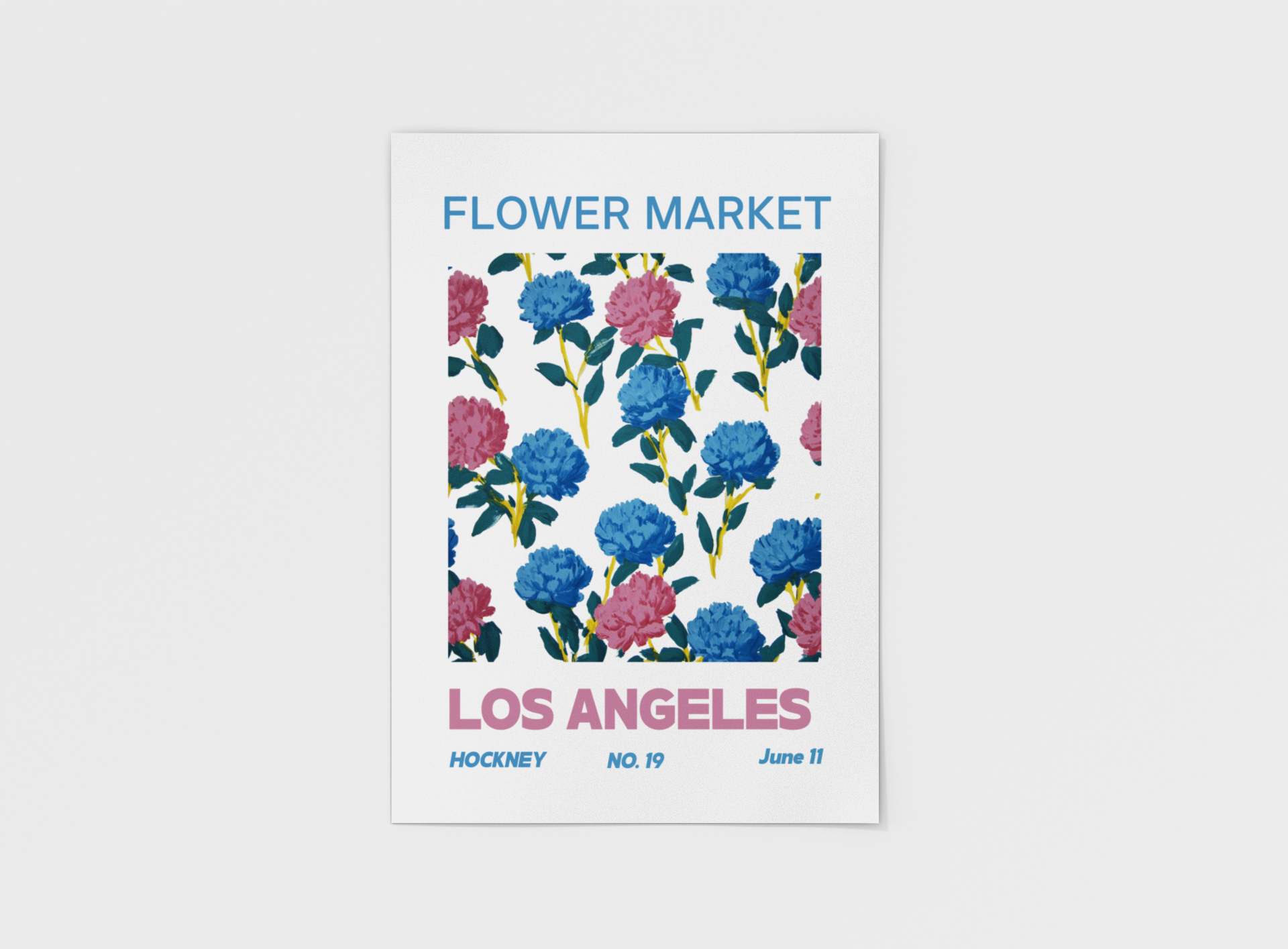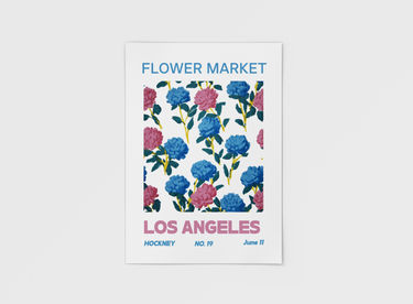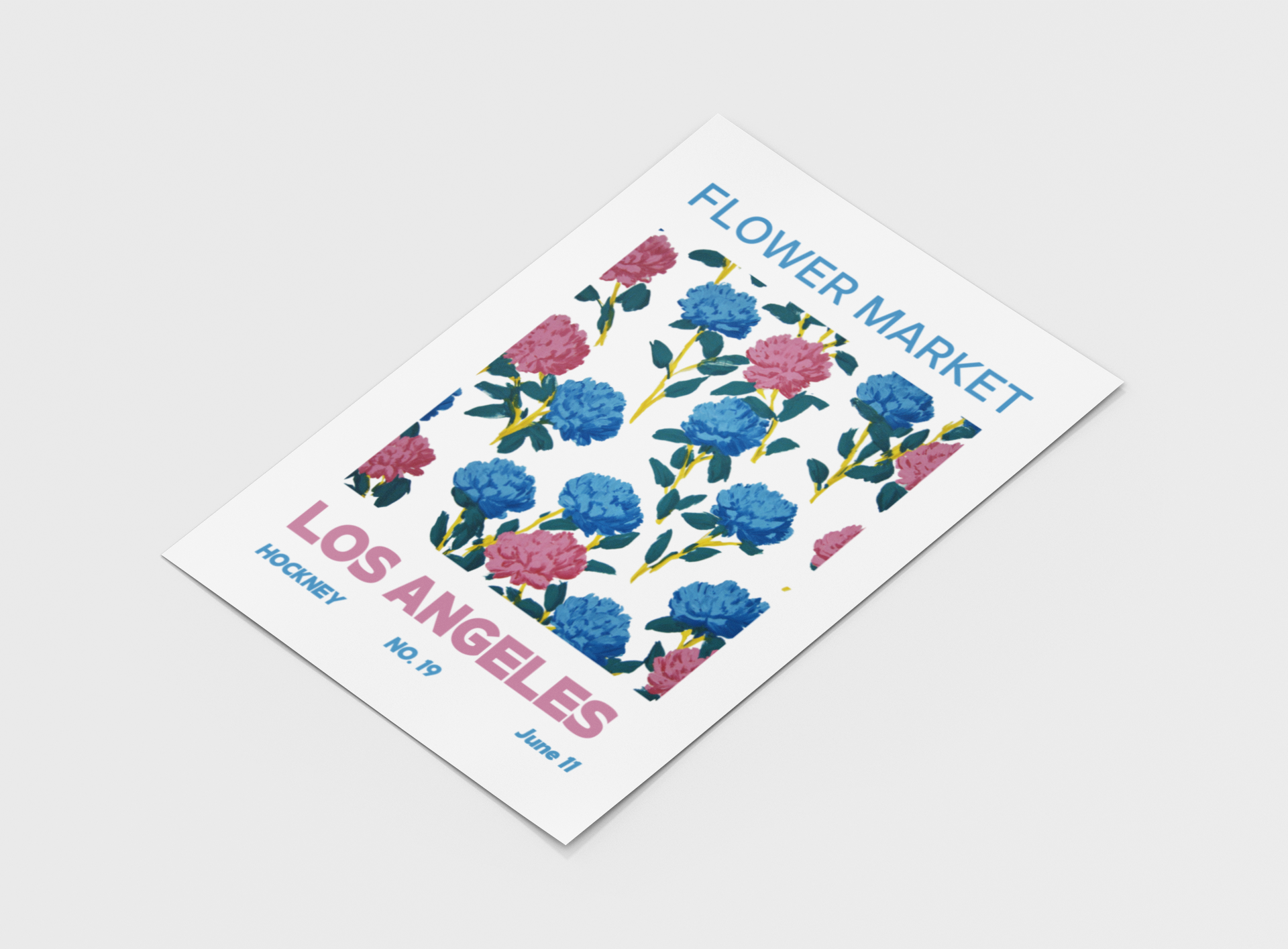A radiant homage to Hockney’s love of everyday beauty, this poster transforms a simple floral pattern into a modern icon of joy and design. Electric blue and pink blooms burst against a sleek black background, each petal outlined in sunlit yellow — a striking contrast that captures the pulse of California’s creative energy.