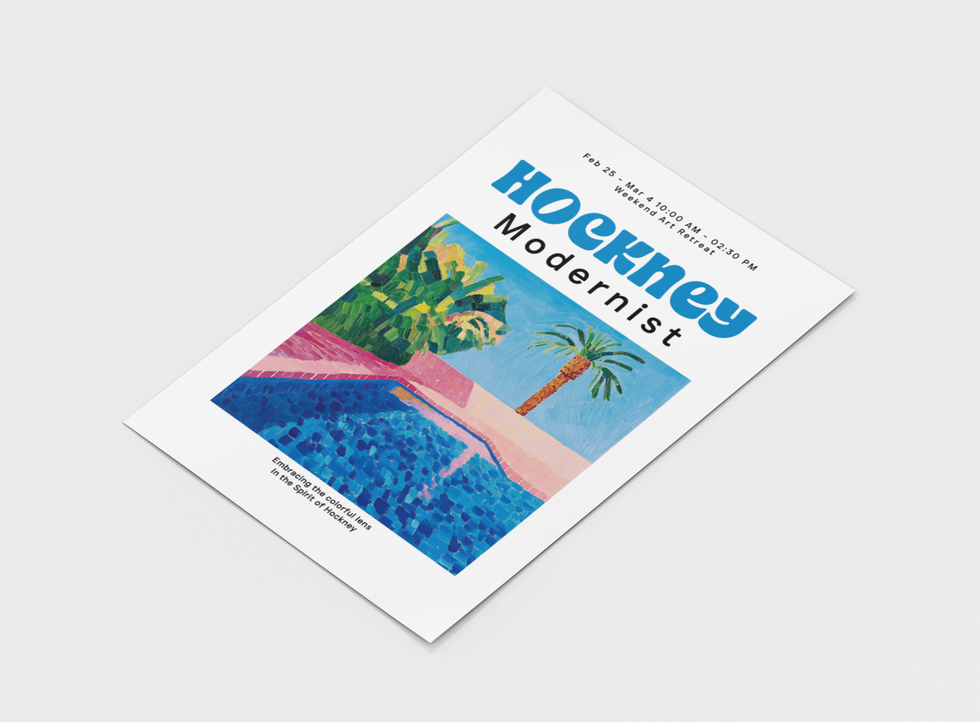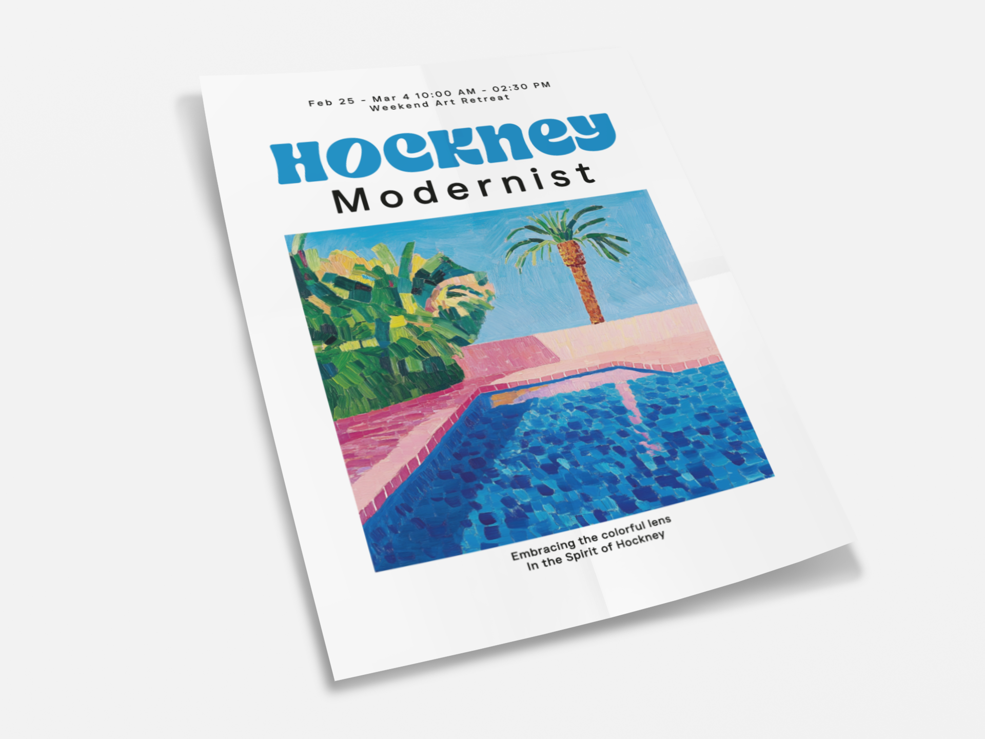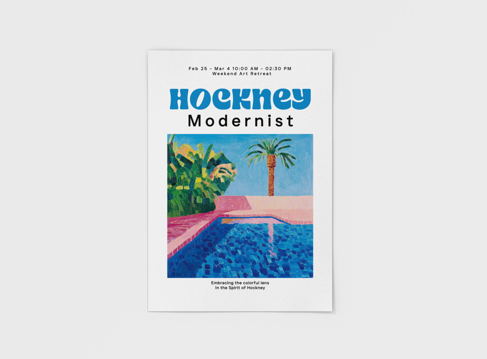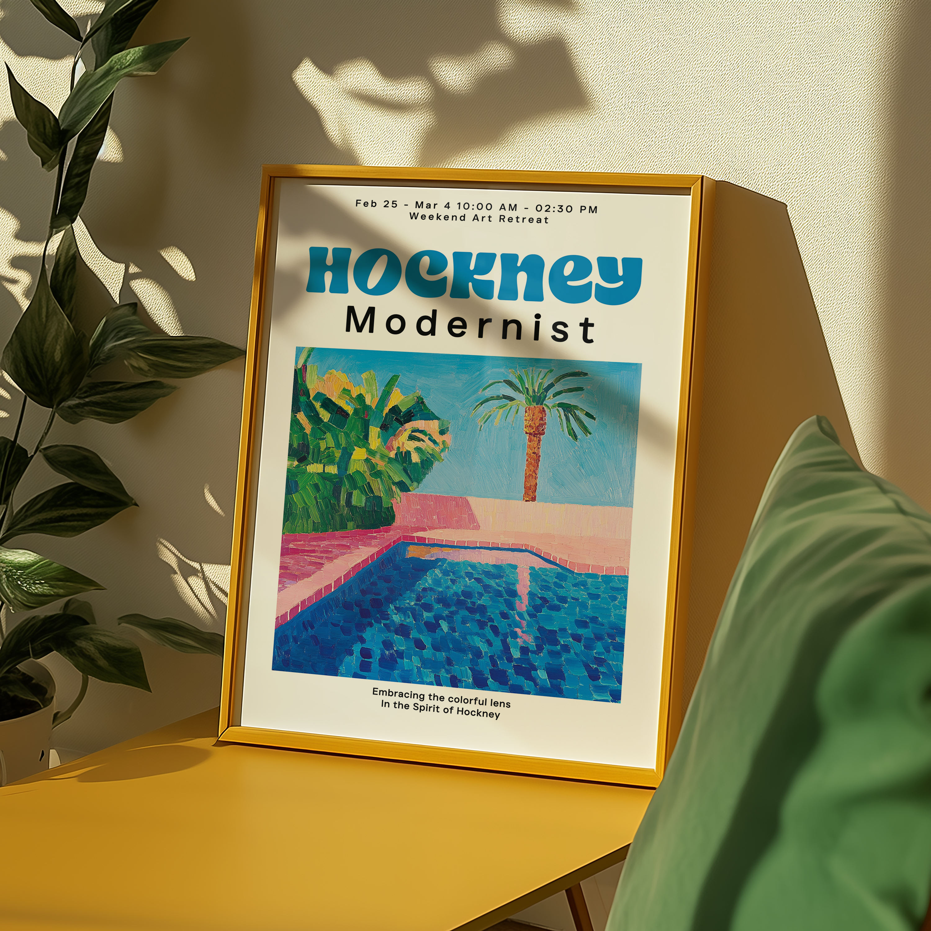 A bold homage to Hockney’s sunlit California dream, this poster radiates with the signature optimism of modernist design. The crystalline blues of the pool ripple beneath the pastel-pink patio, framed by lush greens and the timeless silhouette of a palm tree — pure Hockney energy distilled into color and form.