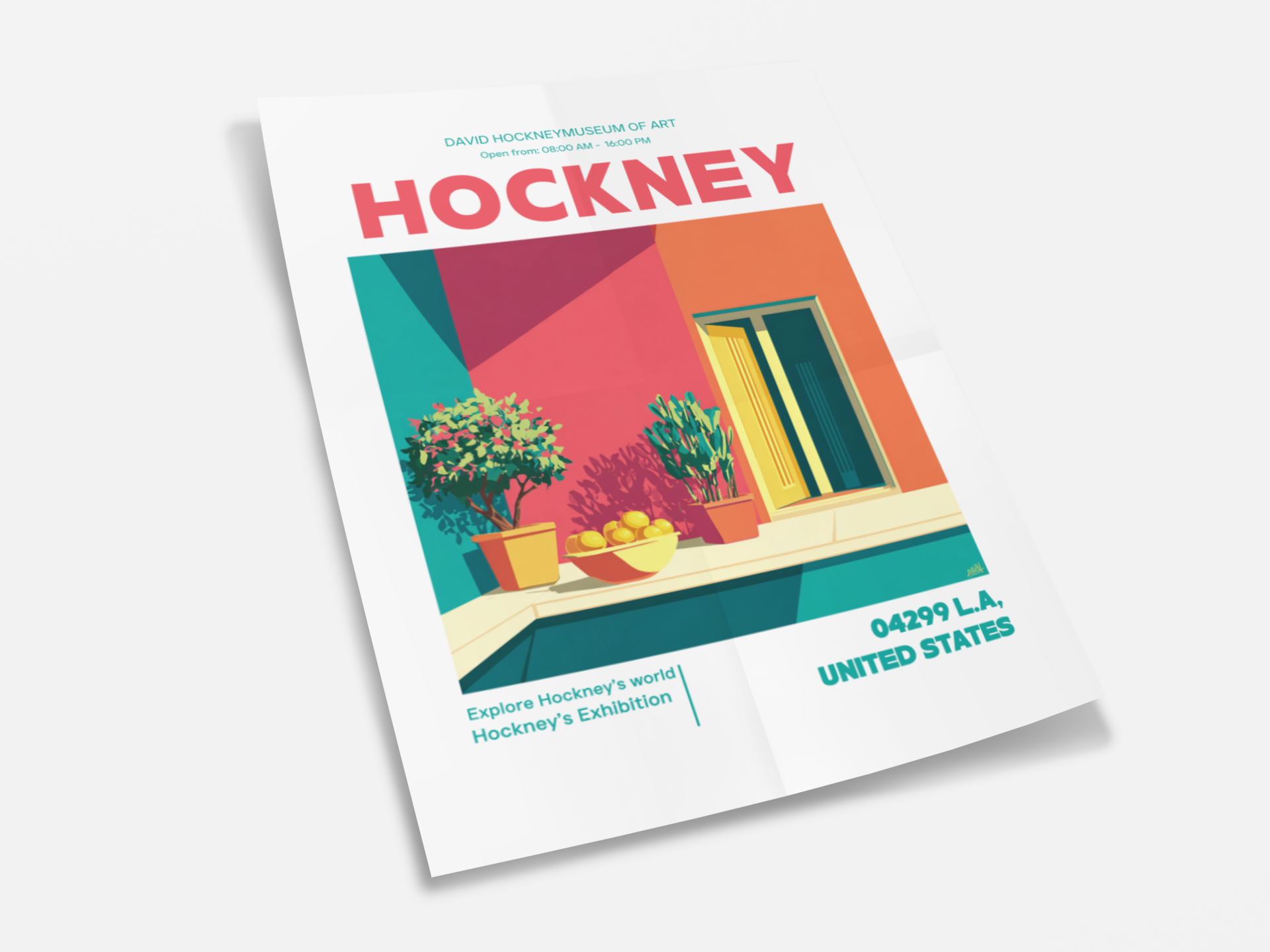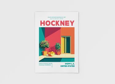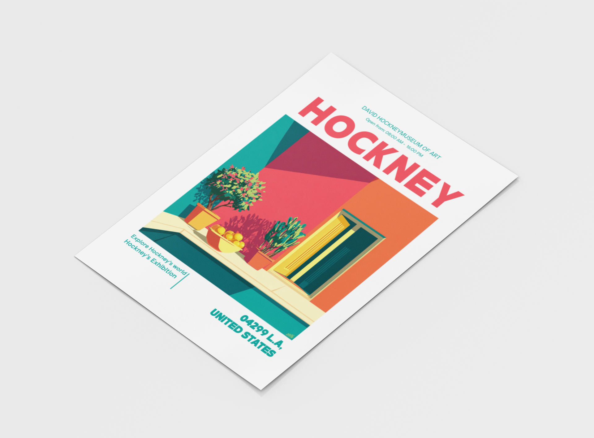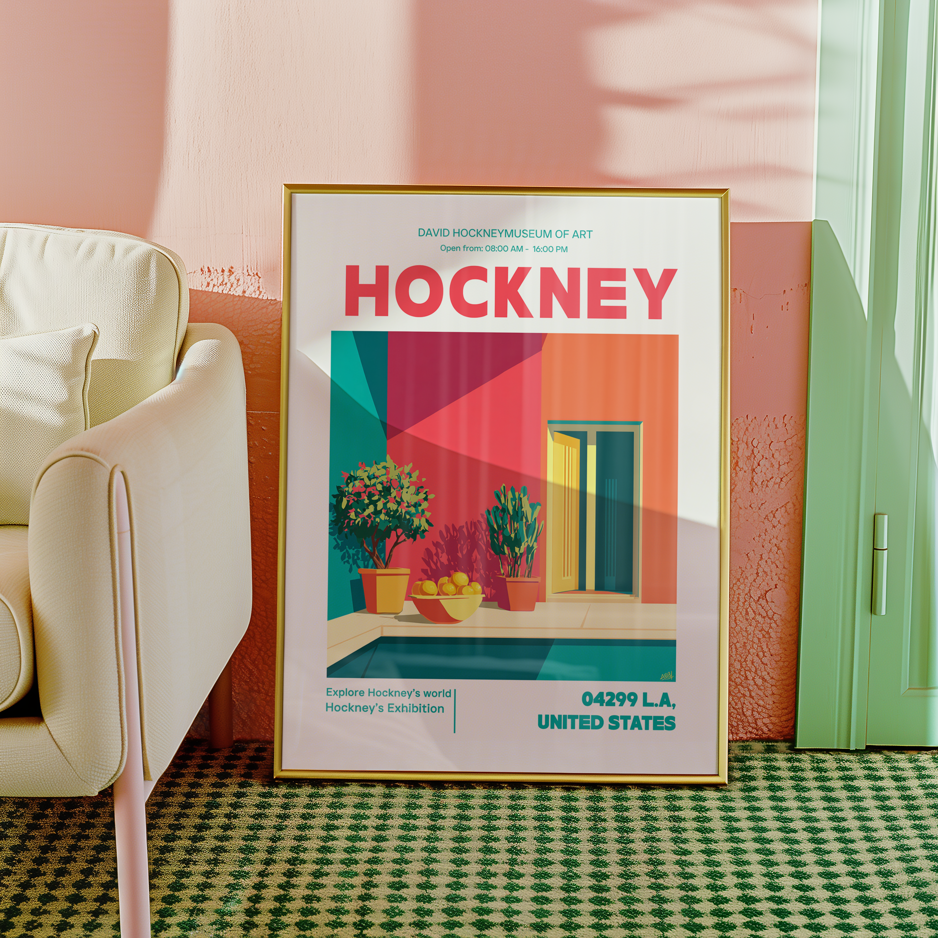 A sun-soaked tribute to Hockney’s unmistakable world, this poster bursts with California color and clean modernist geometry. Bold coral walls, teal shadows, and golden sunlight play in harmony — transforming a quiet terrace into a stage for light, shape, and leisure.