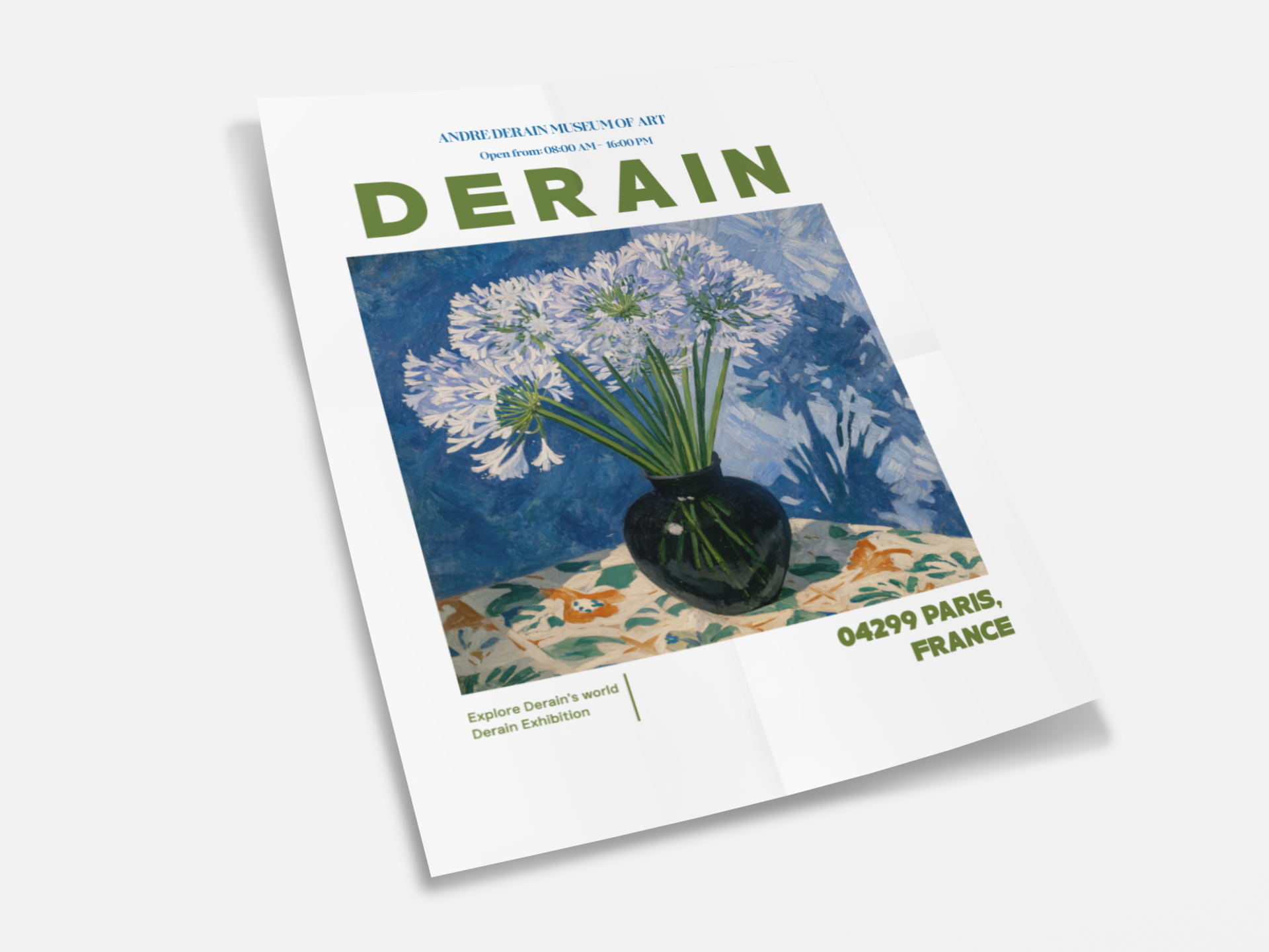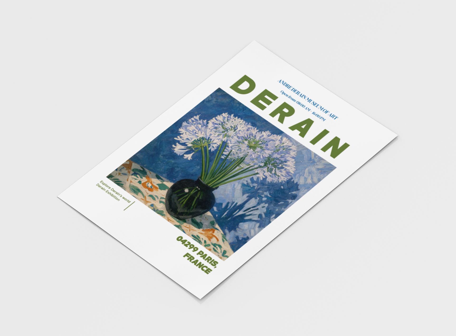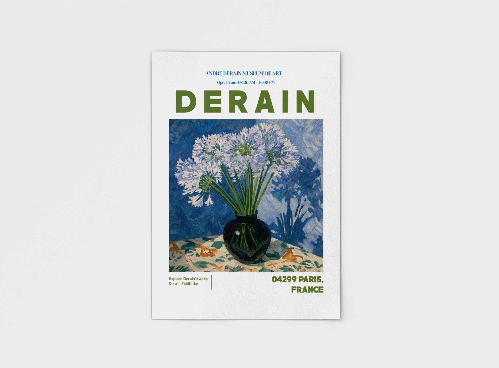 This André Derain–inspired poster radiates the harmony of Fauvism and classic elegance. The striking composition of delicate white blooms against bold blues and greens captures Derain’s signature balance between intensity and calm. Every brushstroke speaks to his mastery of light — translating stillness into vivid emotion.