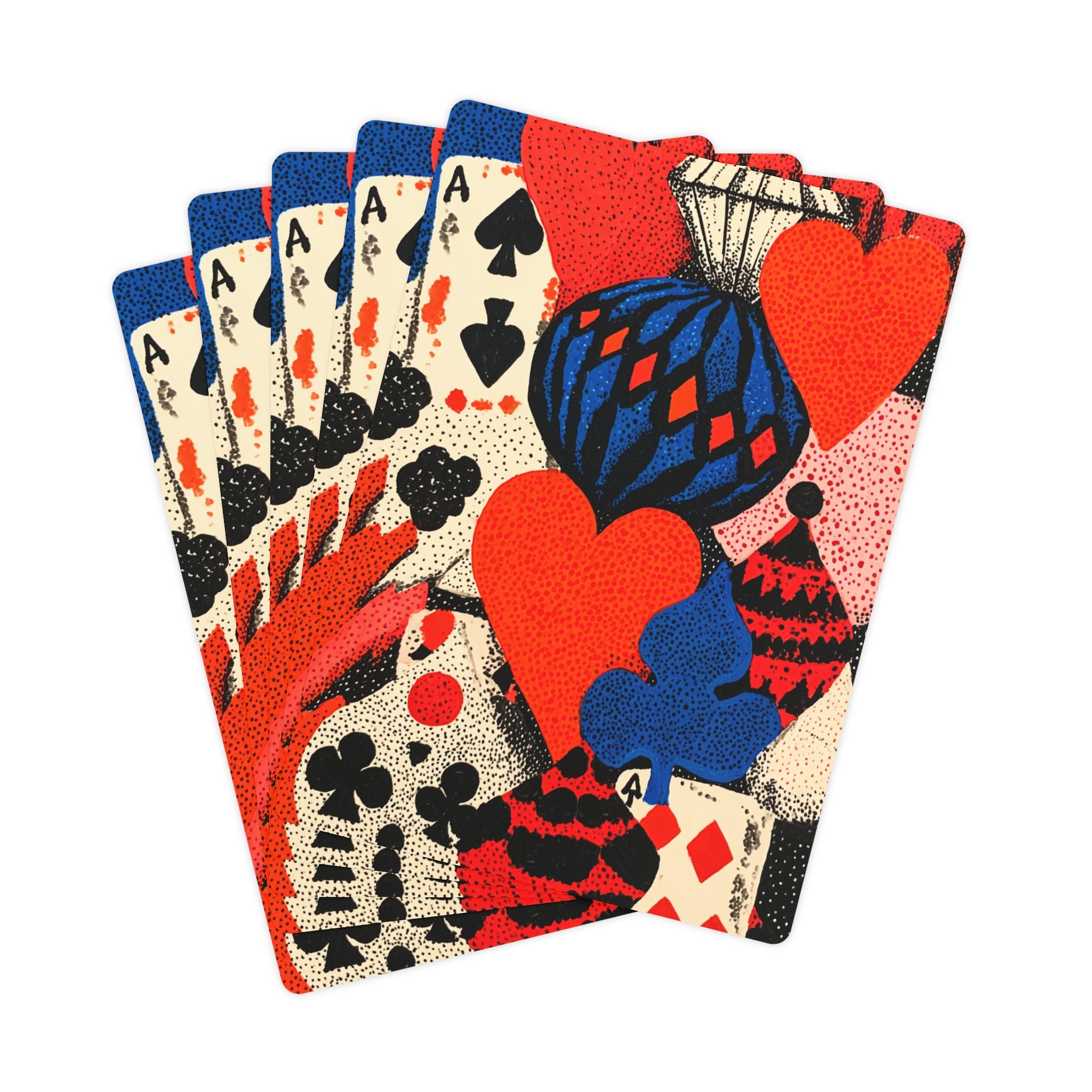 A deck straight out of a dream. This playful design transforms classic playing cards through Yayoi Kusama’s world of repetition and rhythm. The dots pulse like tiny constellations, while hearts, spades, and clubs float in a surreal field of bold reds, electric blues, and inky blacks. It’s hypnotic, vibrant, and just a little eccentric — a visual trip that turns every game into an art piece.