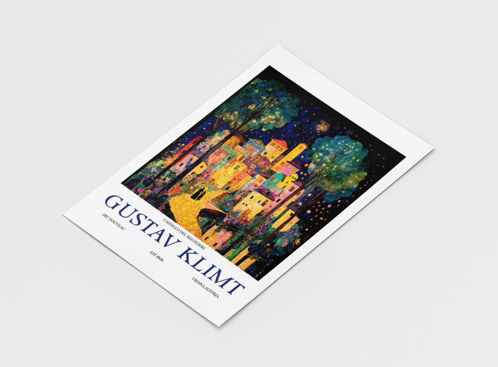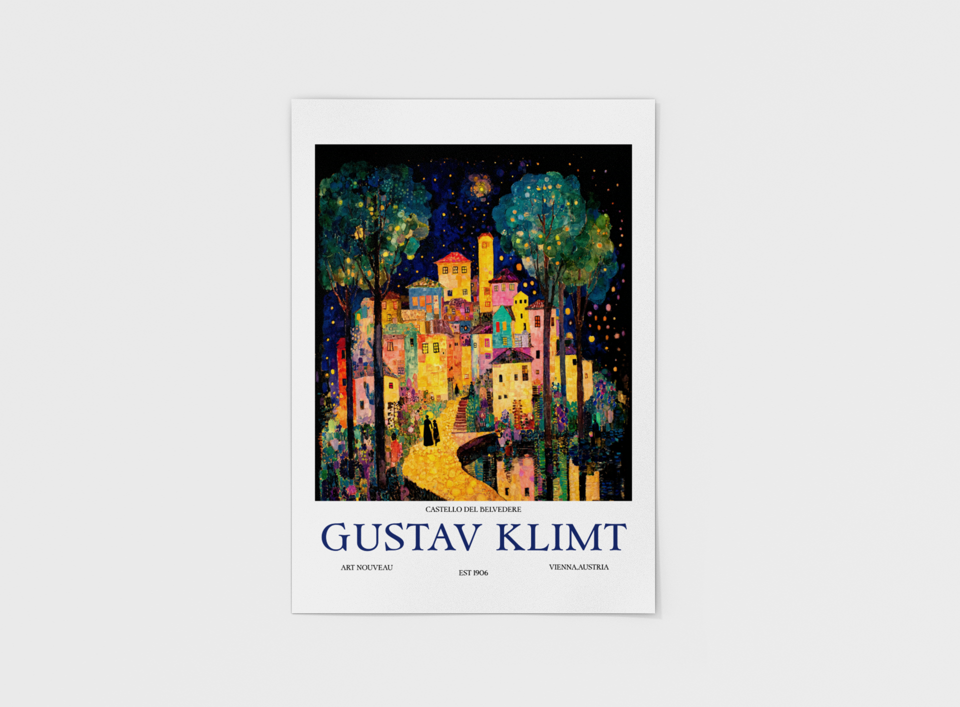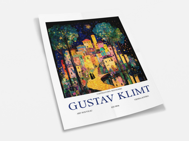 Radiant and dreamlike, this piece channels Klimt’s golden era through a nocturnal cityscape glowing with jewel tones and mosaic-like precision. The warm lights of the village contrast against the deep indigo sky, evoking both intimacy and mystery.