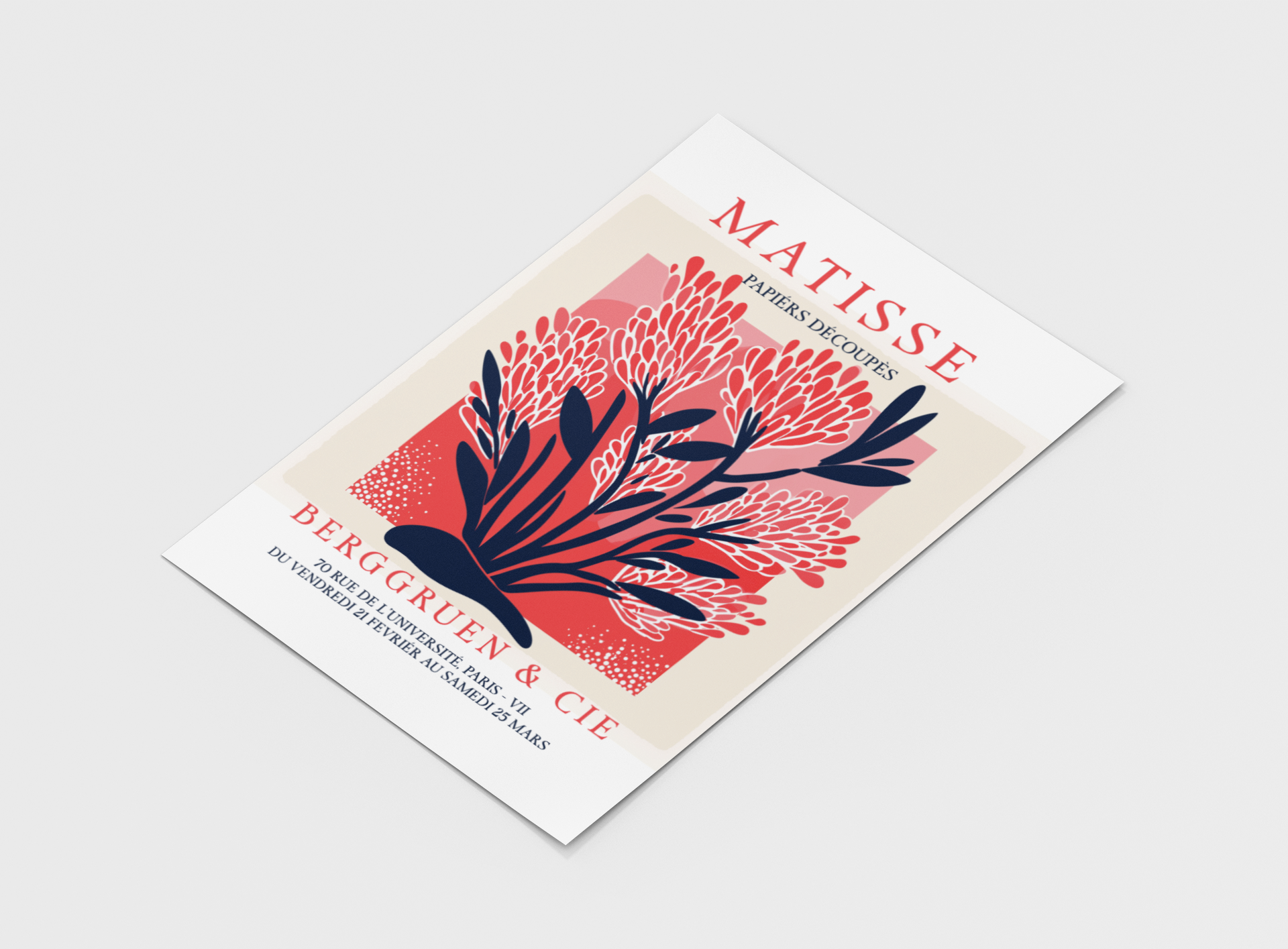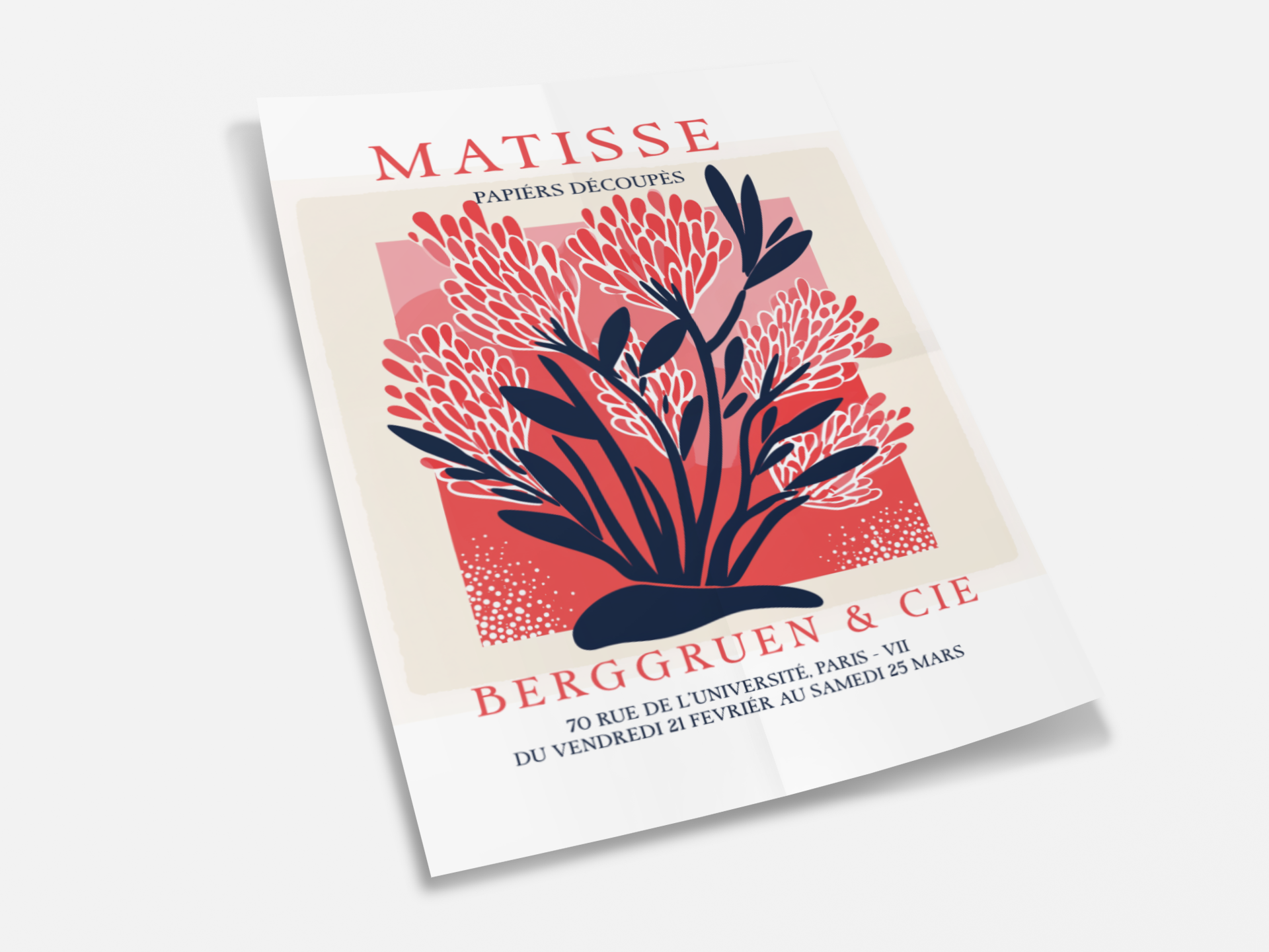 Bold, fluid shapes meet playful color blocks in this floral cutout, echoing Matisse’s iconic paper collages. A striking mix of simplicity and rhythm, it turns petals into pure modern art energy—perfect for walls that want to bloom with style.