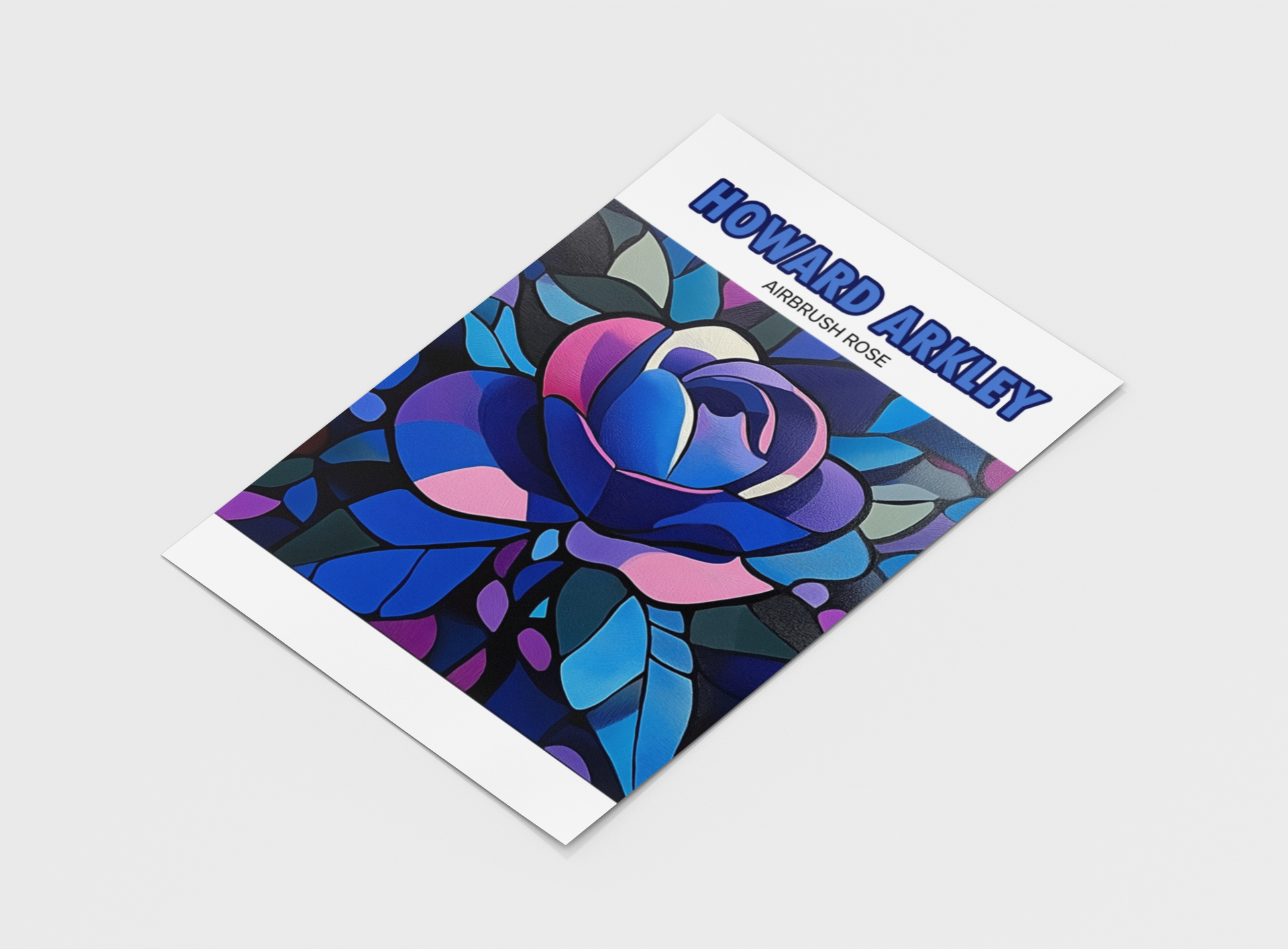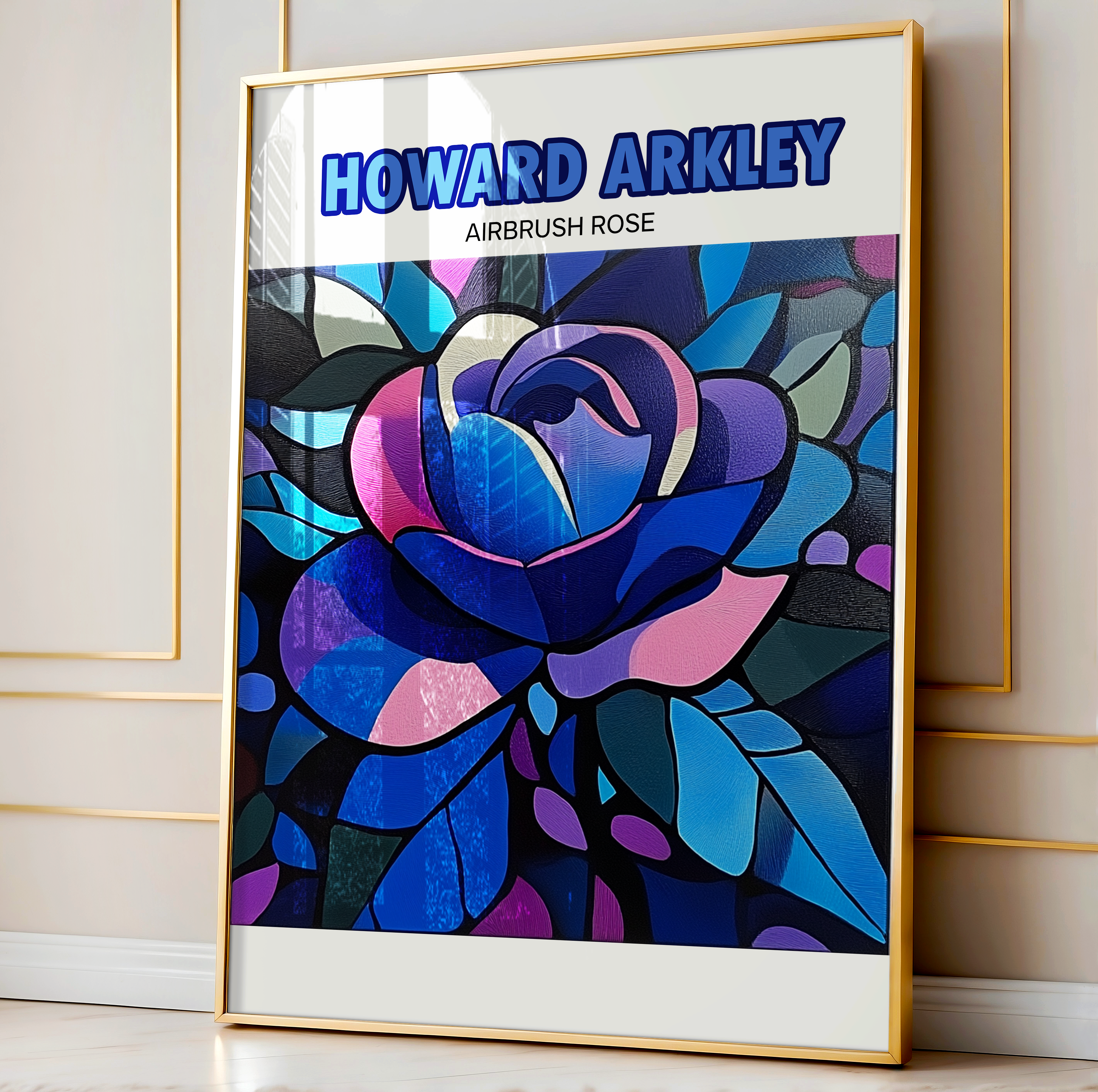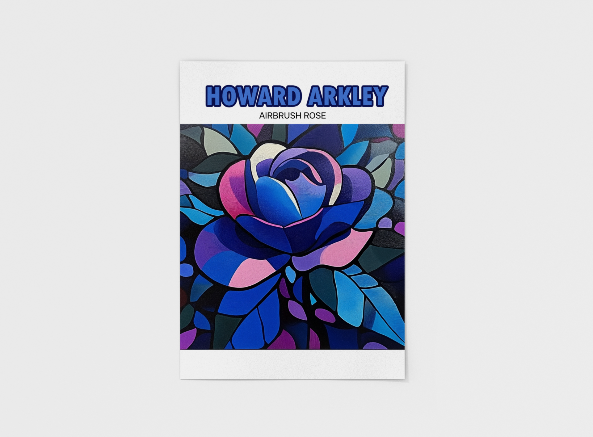 This piece channels Howard Arkley’s signature fusion of bold geometry and vivid color. The Blue Rose blooms with layered gradients of indigo, violet, and fuchsia — transforming the natural form into a modern stained-glass abstraction. A striking blend of pop-art energy and architectural precision, it captures Arkley’s vision of turning the ordinary into radiant suburban poetry.
