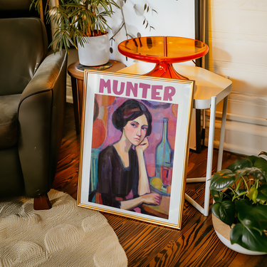 Expressive, introspective, and strikingly modern — this Münter-inspired piece captures the quiet power of the human gaze through bold color and confident form. The subject’s contemplative pose contrasts with the rhythmic swirls of fuchsia, orange, and indigo that surround her, radiating both intimacy and strength.