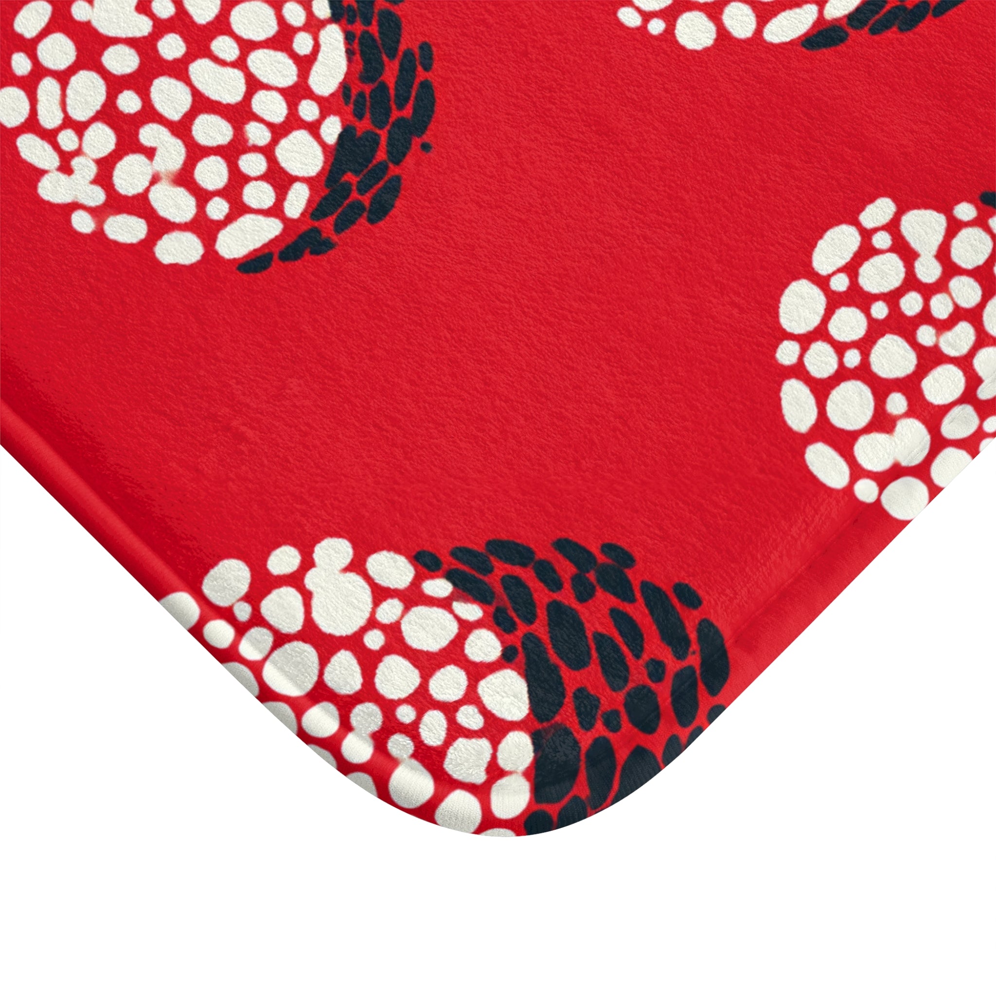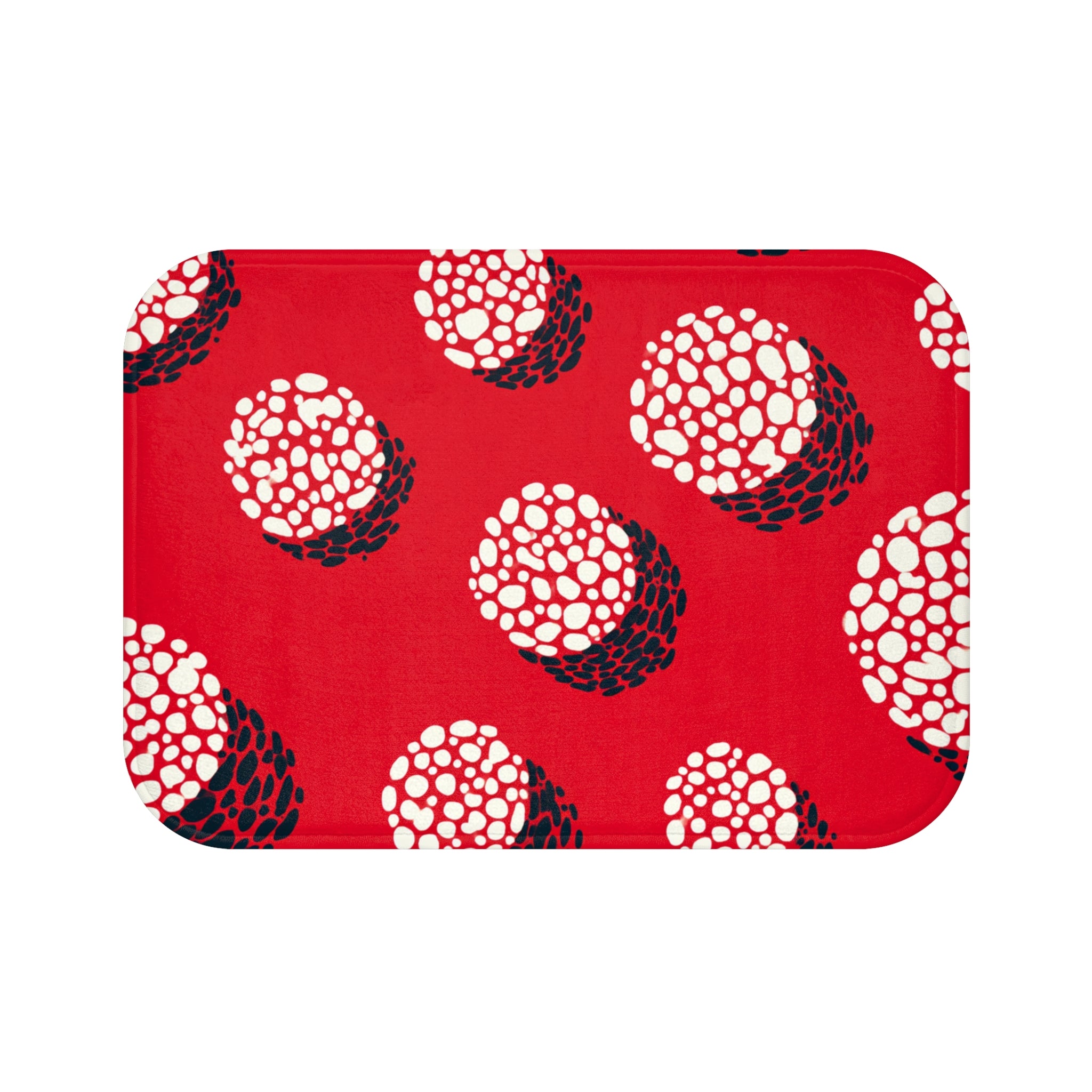 Step into avant-garde comfort with this Yayoi Kusama inspired bath mat. The striking red canvas dotted with organic white and black forms captures Kusama’s signature obsession with repetition, rhythm, and infinity. Each clustered circle radiates a sense of playful depth — transforming your bathroom floor into a living piece of pop-art minimalism.