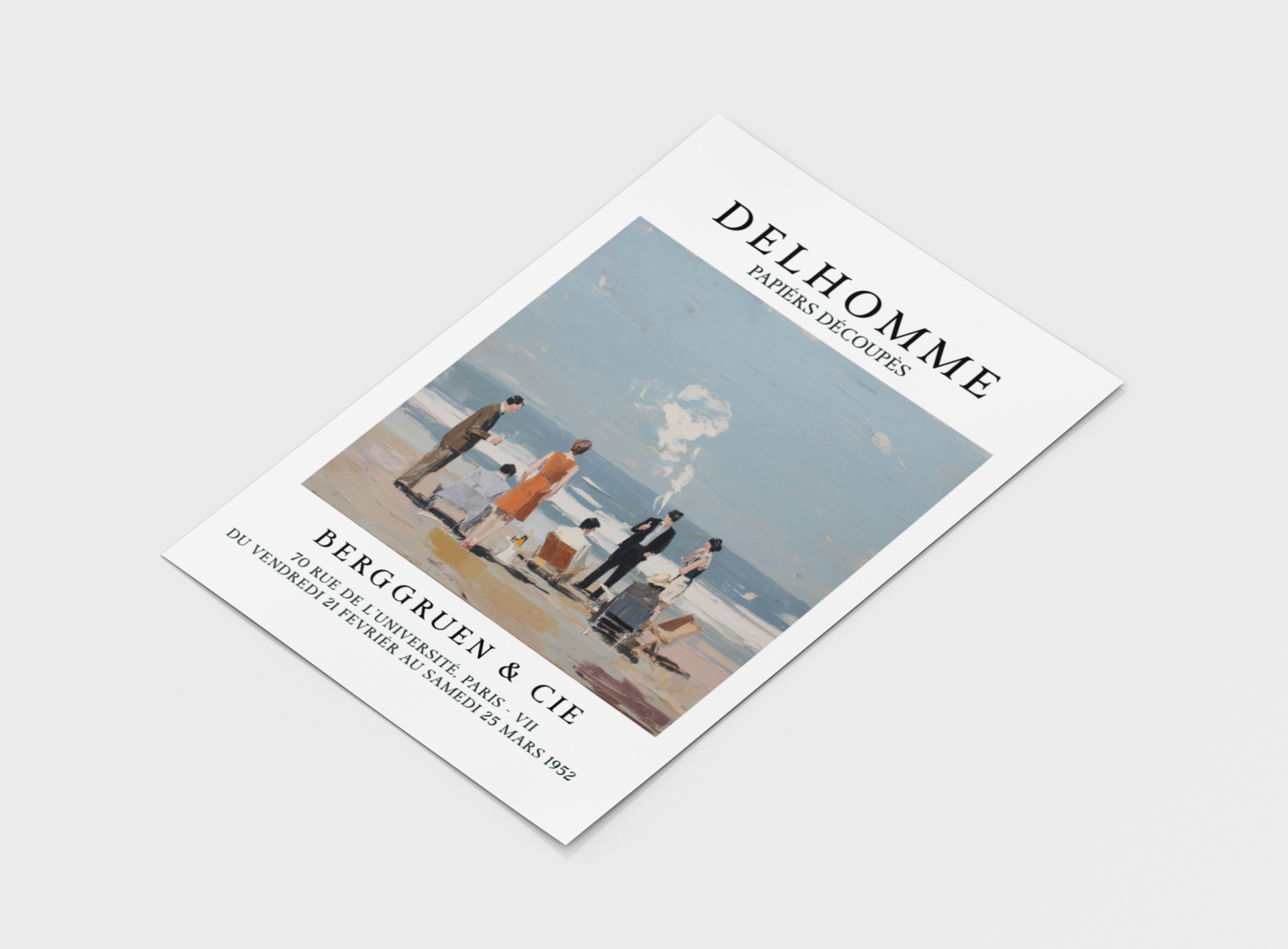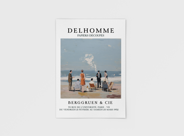 Set against a muted seaside horizon, this Delhomme-inspired poster captures the effortless sophistication of mid-century leisure. A group of elegantly dressed Parisians gathers on the beach — their tailored suits and summer dresses rendered with the artist’s signature loose brushwork and refined restraint. The scene is quiet yet charged with atmosphere, a moment of calm conversation beneath a pastel sky.
