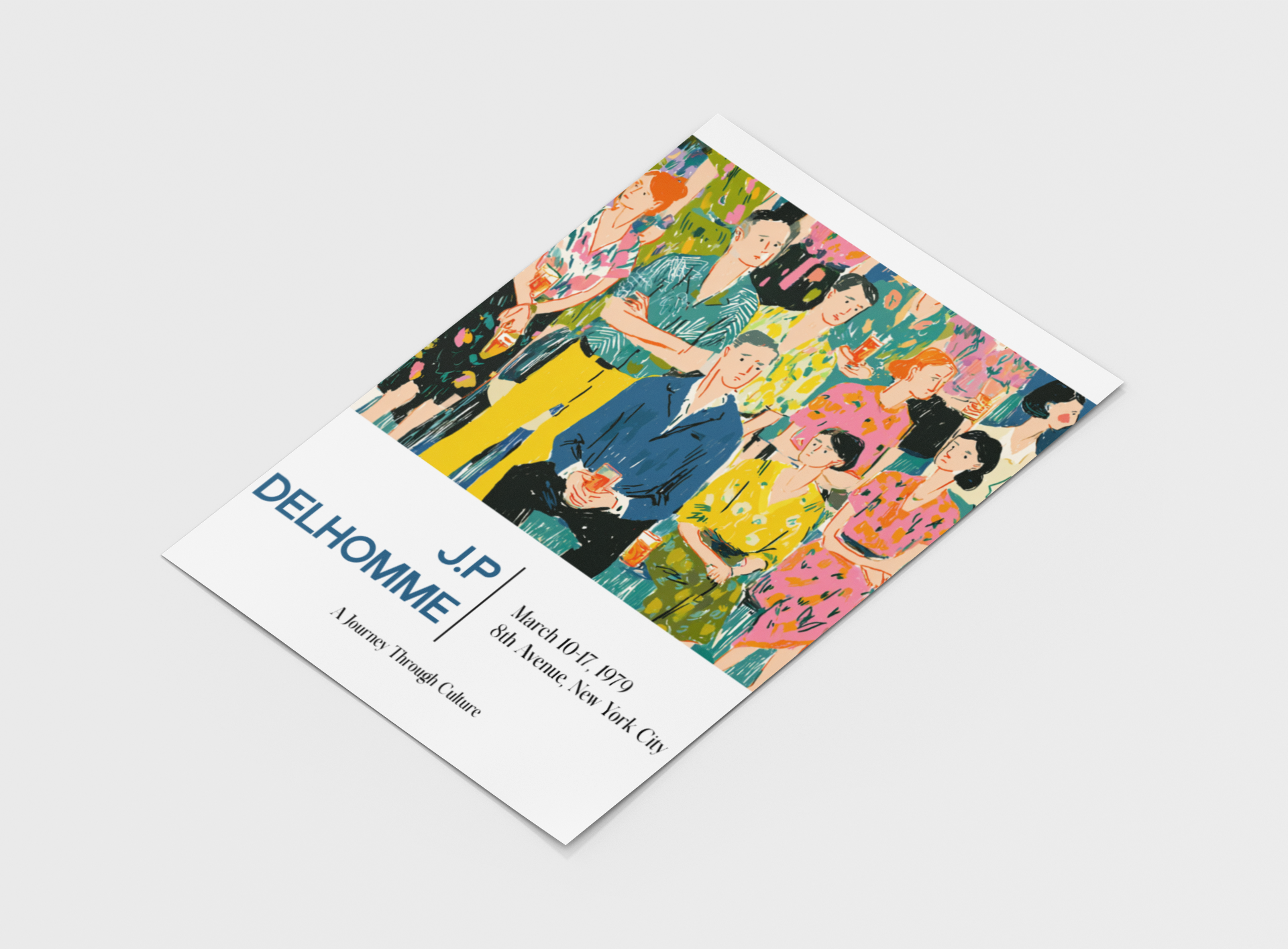Vibrant, witty, and unmistakably cosmopolitan, this poster channels Jean-Philippe Delhomme’s signature portrayal of modern social life. A lively gathering of stylish individuals, dressed in playful prints and effortless charm, captures the spirit of an era defined by conversation, art, and subtle sophistication.