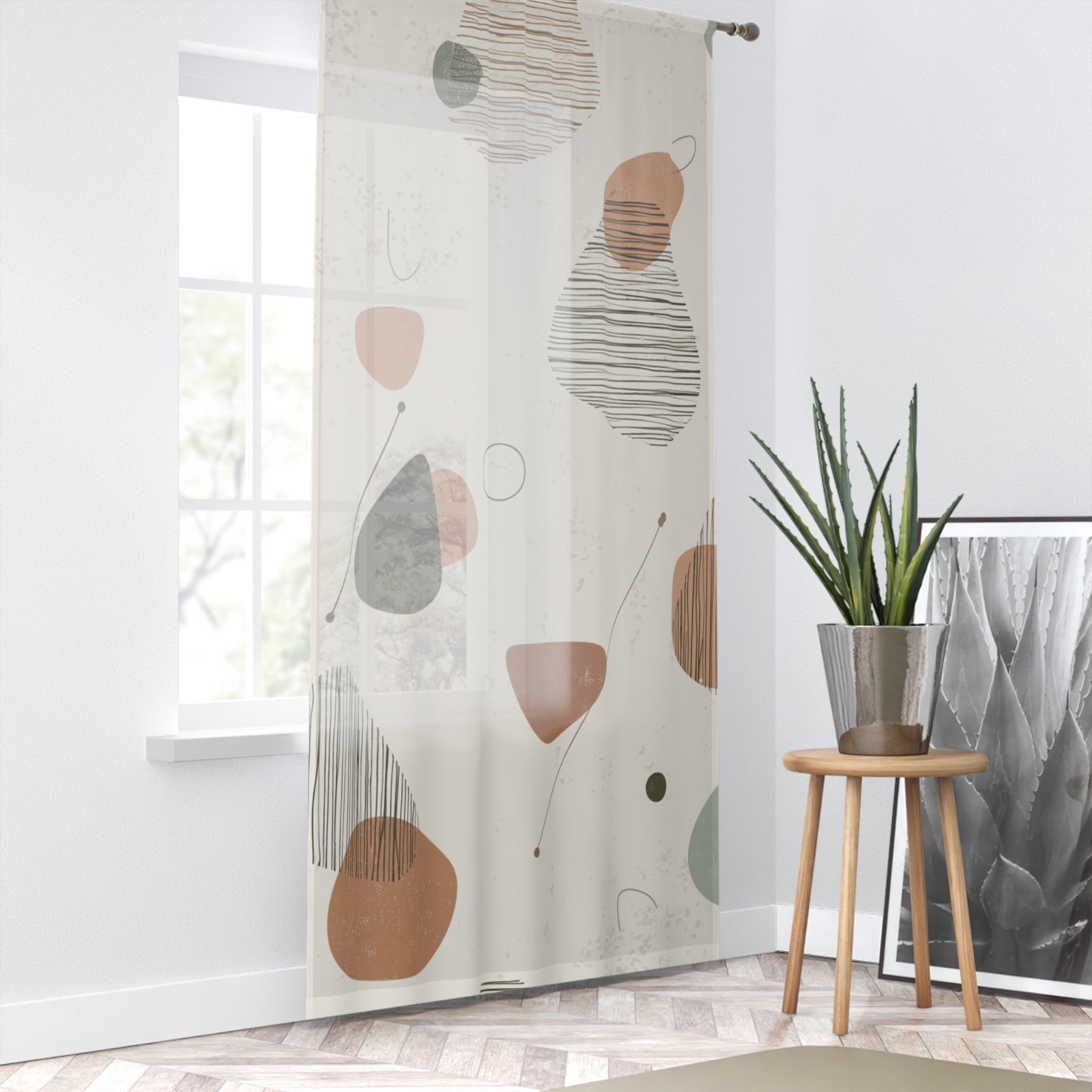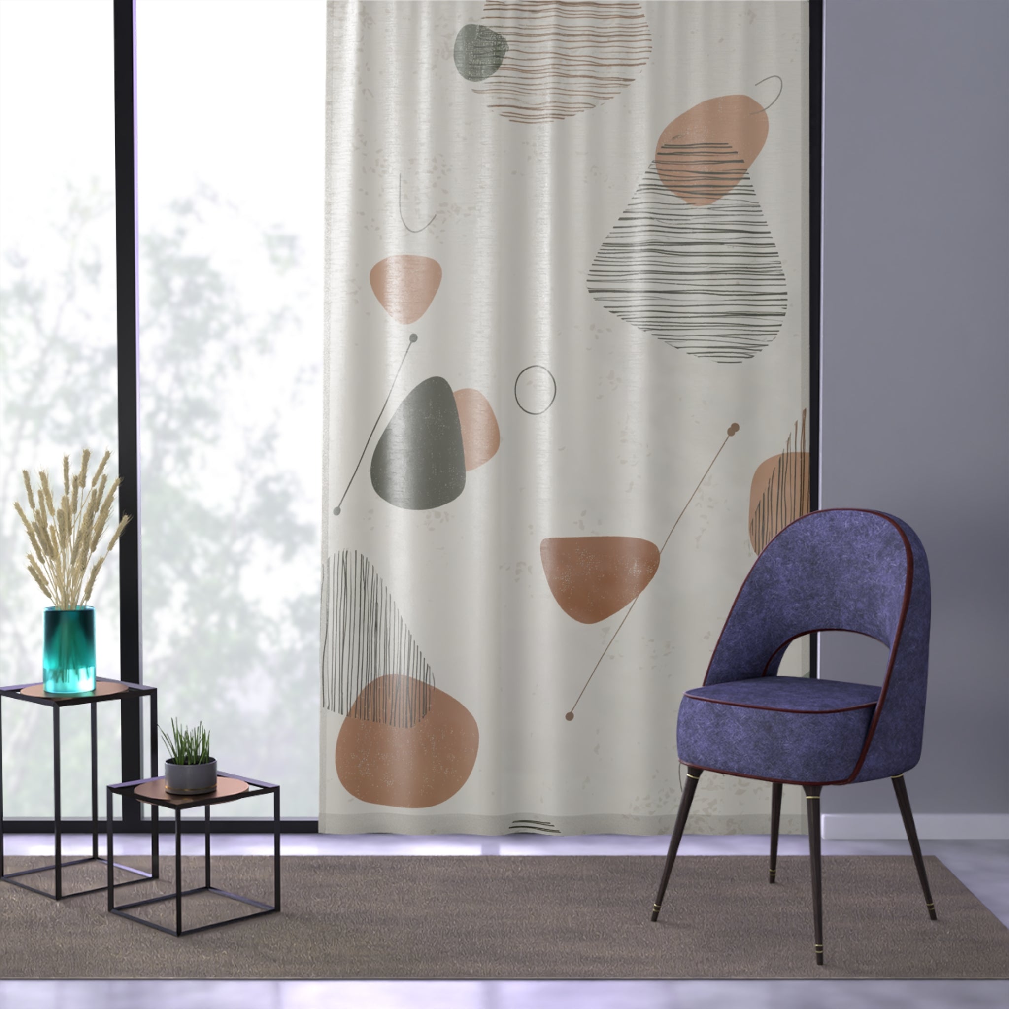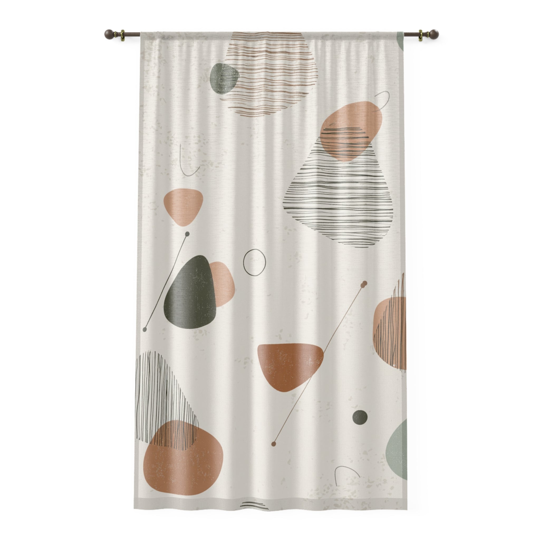 The Mid-Century Drift Window Curtain brings that smooth, effortless modernist swagger straight into your living space. Abstract pebbles, soft earth tones, and those unmistakable atomic-era lines float across the fabric like they were sketched during a 1950s design meeting—right before everyone went for martinis at lunch.