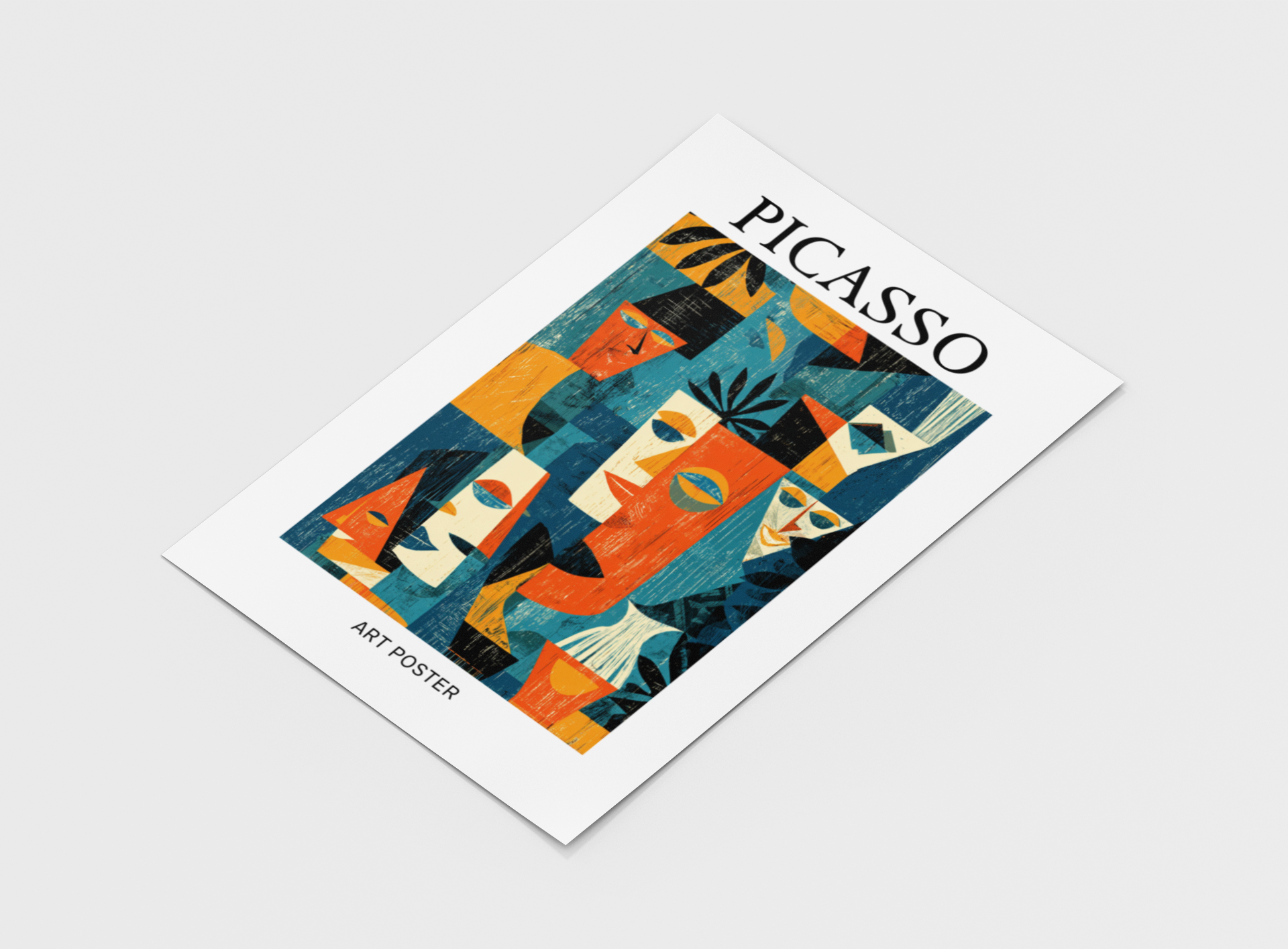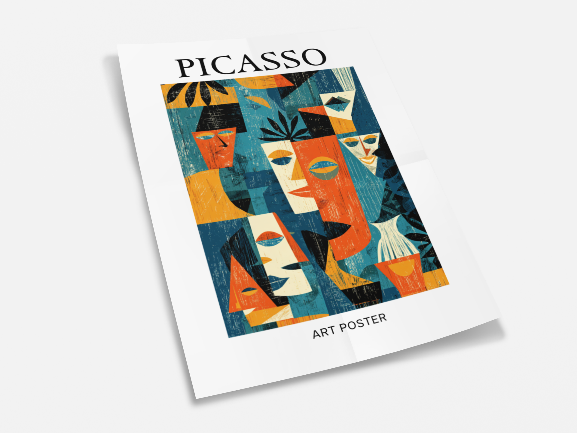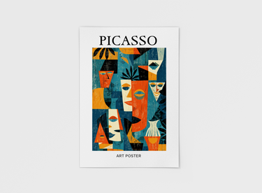 A bold celebration of Picasso’s cubist influence — this poster reimagines human expression through fragmented forms and vivid contrast. Warm oranges and deep blues collide in a rhythmic composition that feels both spontaneous and structured. Each face tells a story of emotion and perspective, blending modern minimalism with mid-century texture — a timeless nod to Picasso’s genius for redefining the human form.
