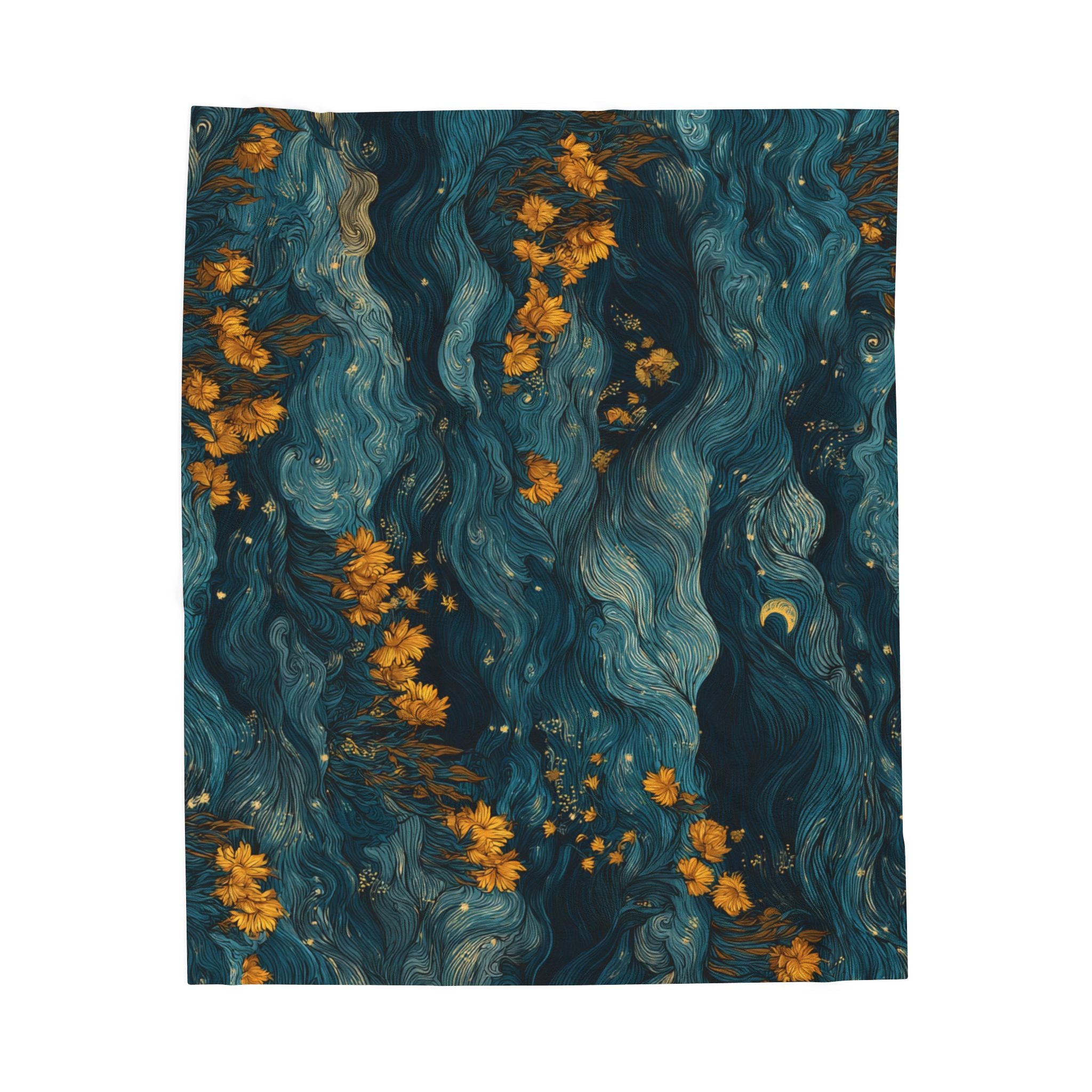 Wrap yourself in a masterpiece. Inspired by Van Gogh’s Starry Night, this velveteen blanket captures the swirling energy of the night sky, reimagined with golden blooms that drift like constellations across deep indigo waves. Each flowing line mirrors Van Gogh’s iconic brushwork — alive with motion, emotion, and dreamlike intensity.