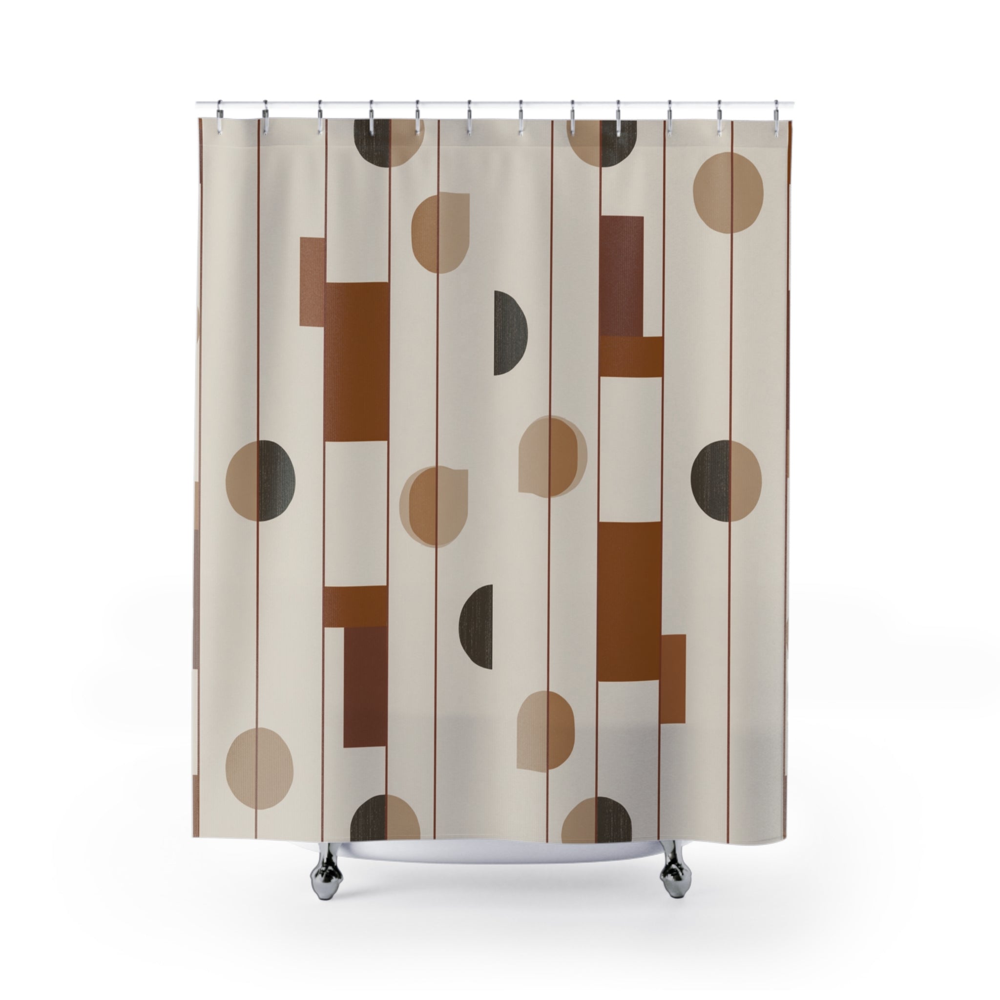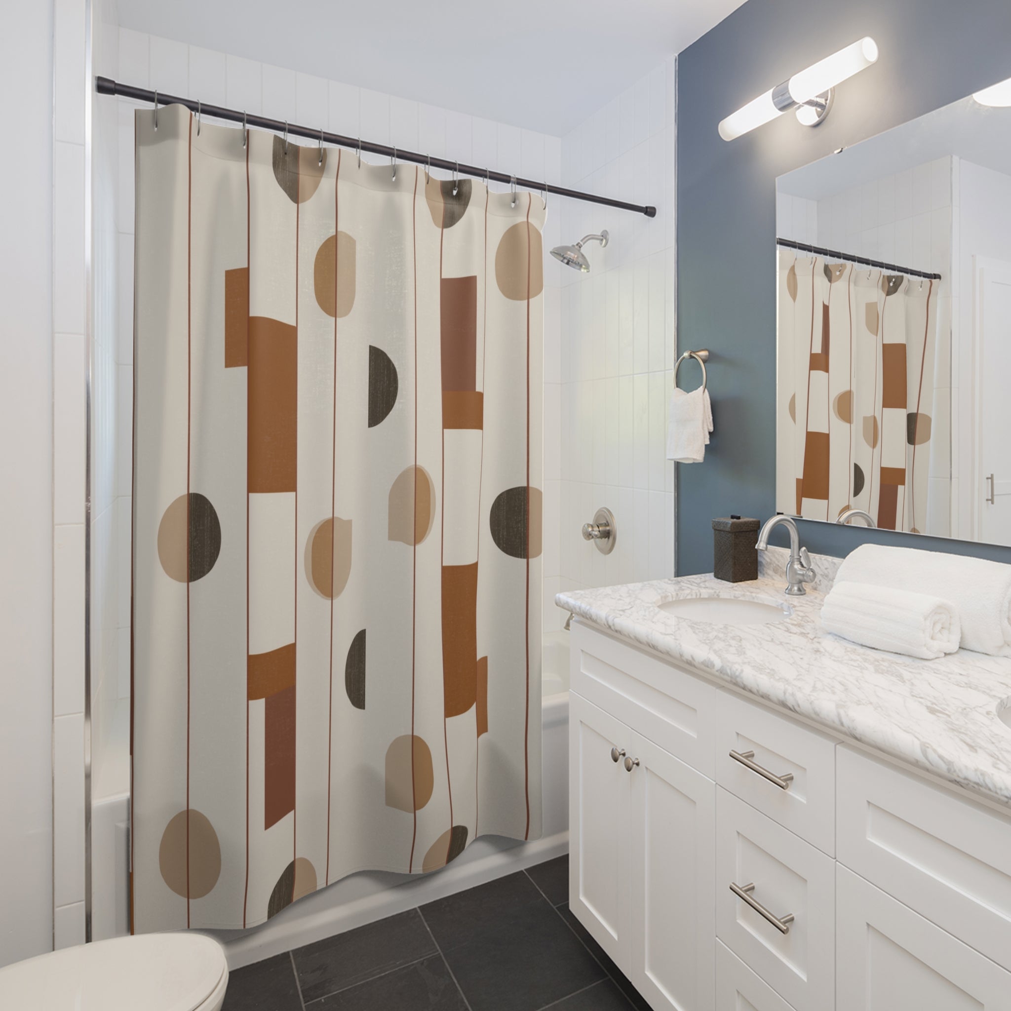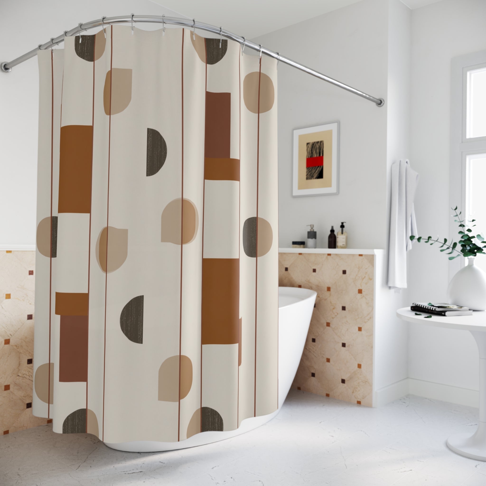 The Mid-Century Balance Shower Curtain turns your bathroom into a mid-century composition. Vertical lines guide the eye, geometric shapes anchor the space, and the warm neutral palette keeps everything feeling relaxed rather than clinical.