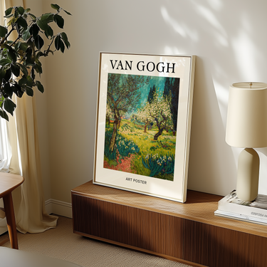This luminous poster celebrates Van Gogh’s love for nature in full bloom. With swirling greens, delicate blossoms, and expressive brushwork, it captures the quiet vitality of a sunlit orchard. Every stroke hums with movement and emotion — a reminder of how Van Gogh saw life in every leaf and branch. Perfect for interiors that crave both color and calm, this piece brings the poetry of Provence right into your space.