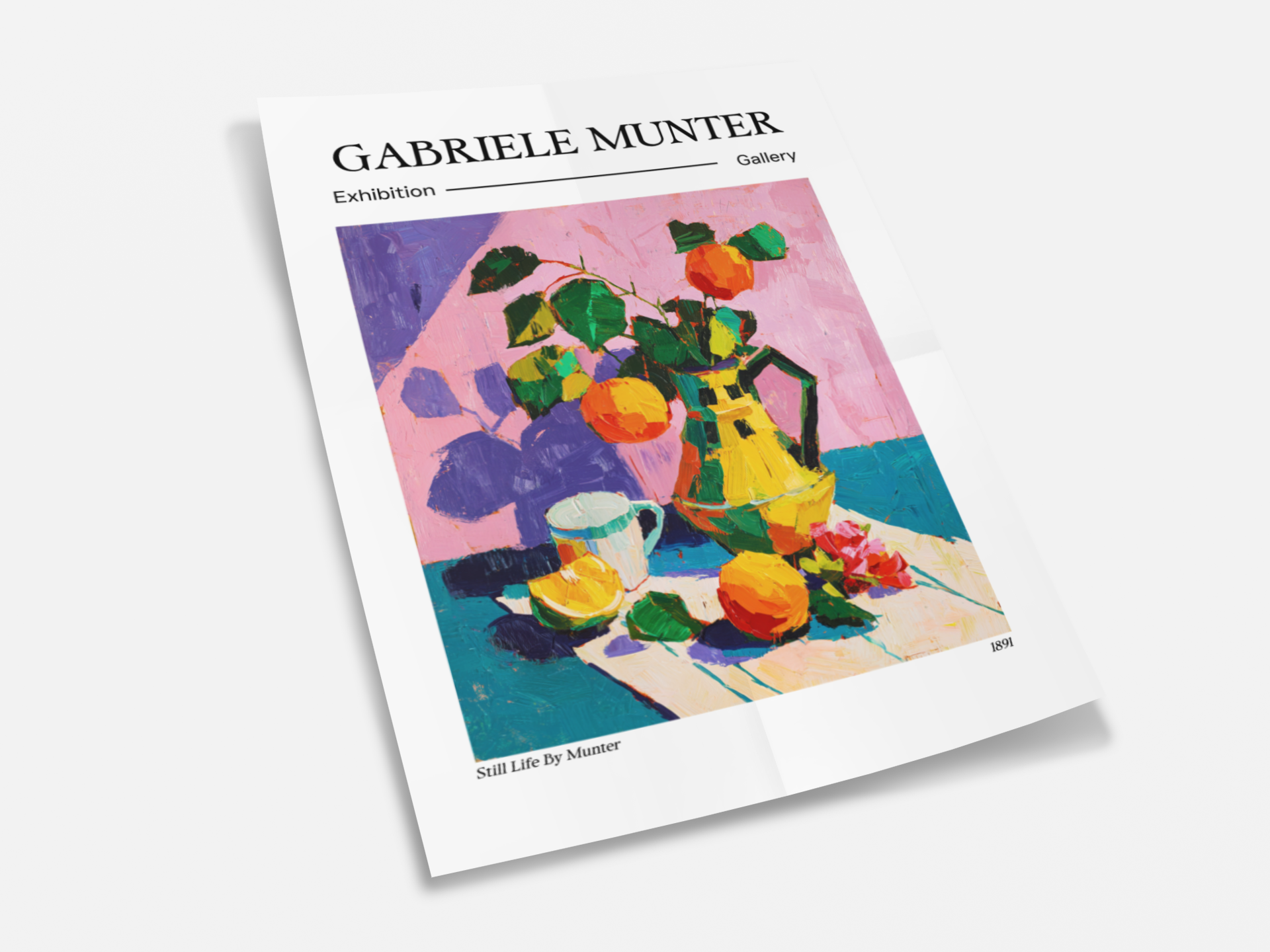 Bursting with expressive energy, this still life channels Gabriele Münter’s fearless use of color and form. The composition transforms everyday objects — oranges, a cup, and a golden pitcher — into vibrant shapes that pulse with emotion and warmth.