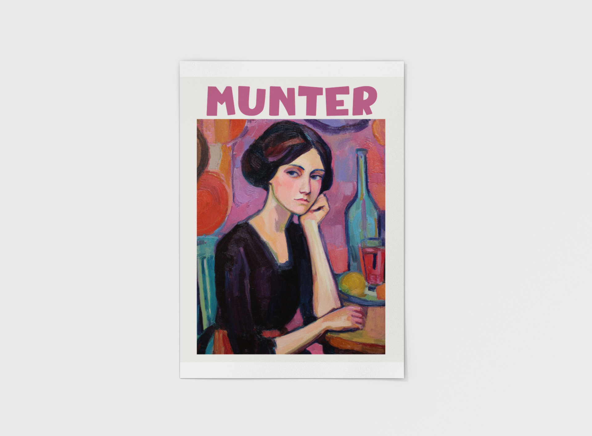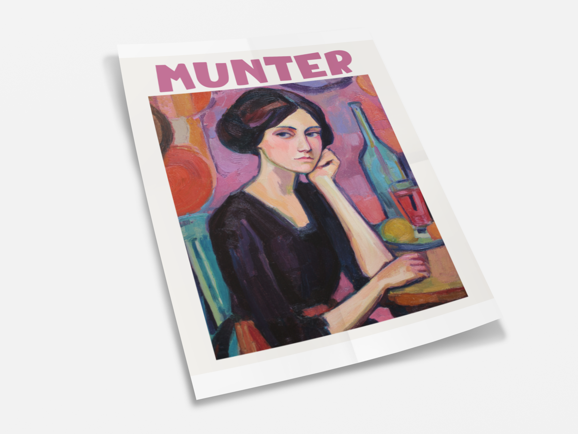 Expressive, introspective, and strikingly modern — this Münter-inspired piece captures the quiet power of the human gaze through bold color and confident form. The subject’s contemplative pose contrasts with the rhythmic swirls of fuchsia, orange, and indigo that surround her, radiating both intimacy and strength.